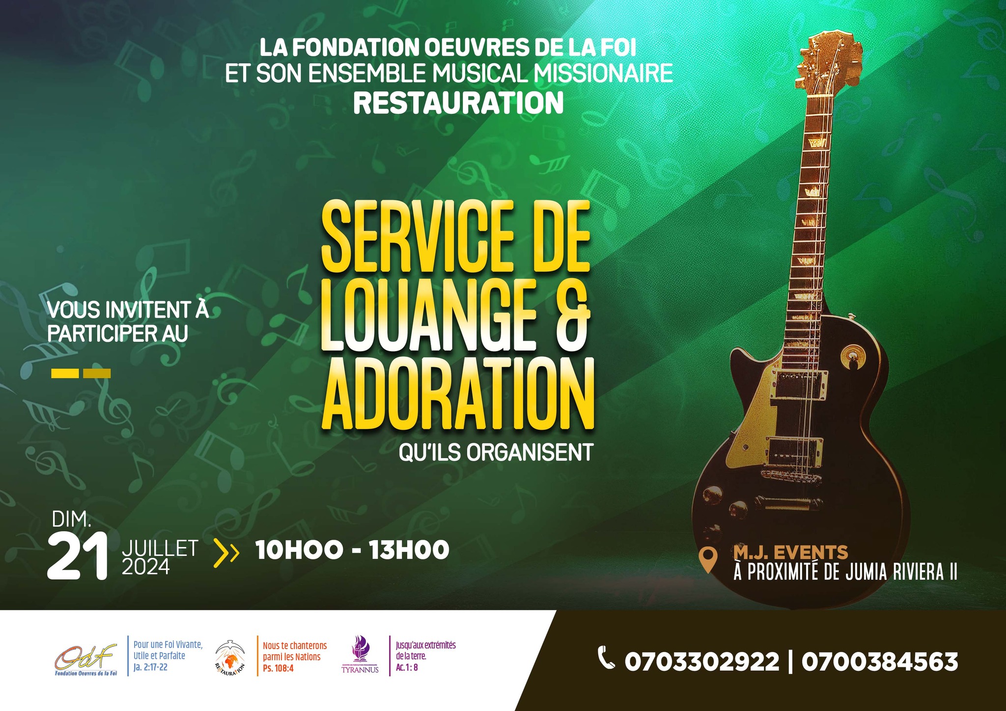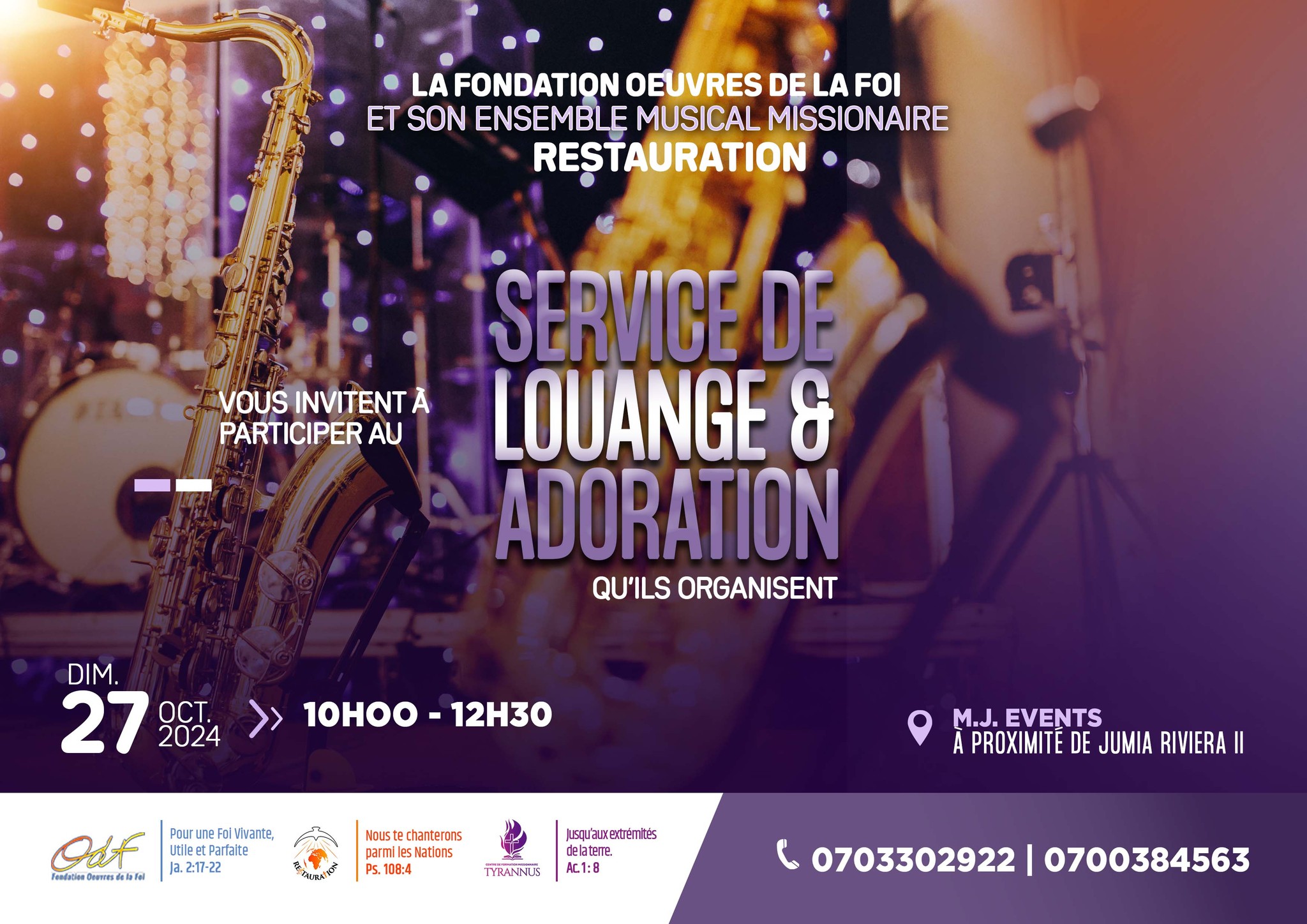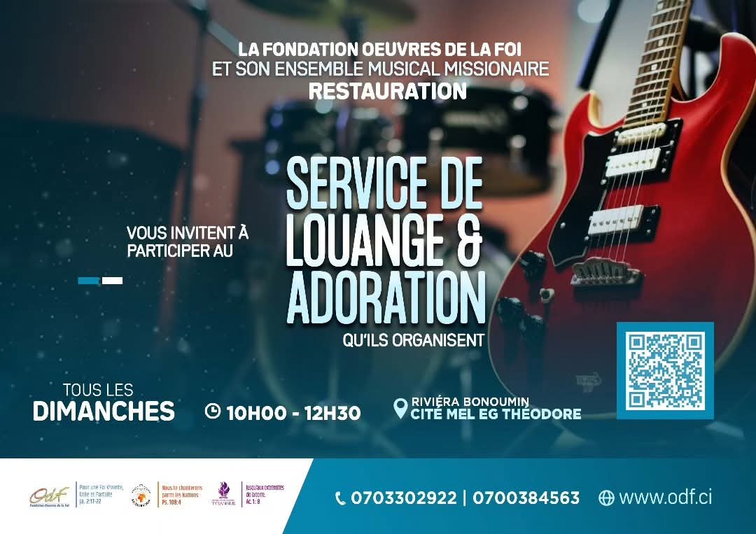 La Fondation Œuvres de la Foi (ODF) et son ensemble musical missionnaire RESTAURATION vous invitent à participer au Service de Louange et Adoration qu'ils organisent, le Dimanche 27 Octobre 2024, à partir de 10H00. Lieu: M. J. EVENTS , à proximité de Jumia Riviera 2. ? https://maps.app.goo.gl/odh1S2Hxazyuki7w8 Infoline: (+225) 07 9890 4417 | 07 5971 9638