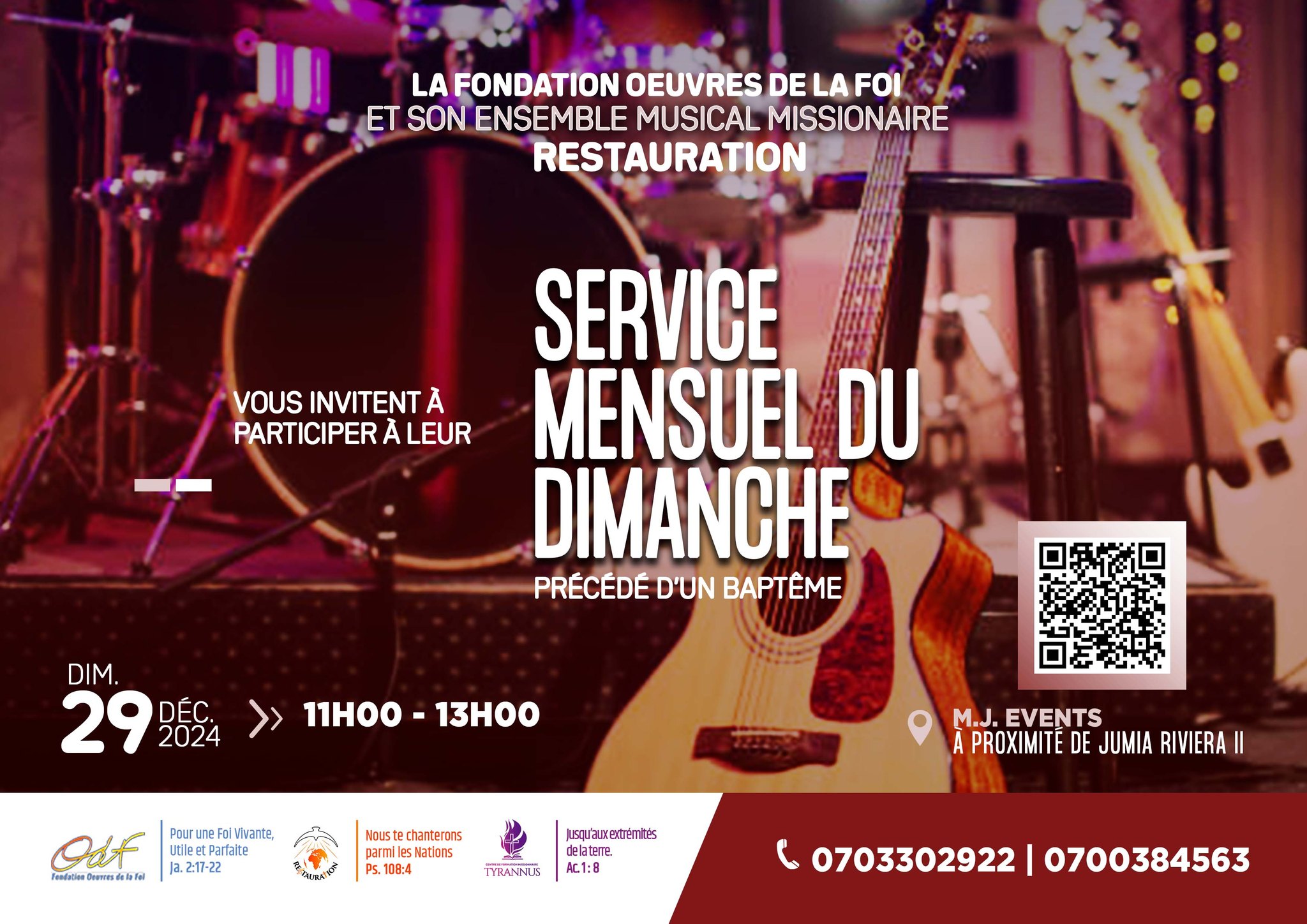 La Fondation Œuvres de la Foi (ODF) et son ensemble musical missionnaire RESTAURATION vous invitent à participer à leur SERVICE MENSUEL DU DIMANCHE précédé d’un baptême, qu'ils organisent le Dimanche 29 Décembre 2024, à partir de 11H00. Lieu: M. J. EVENTS , à proximité de Jumia Riviera 2. ? https://maps.app.goo.gl/odh1S2Hxazyuki7w8 Infoline: (+225) 07 9890 4417 | 07 5971 9638