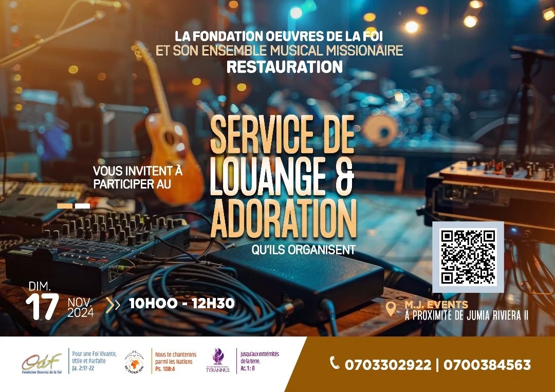 La Fondation Œuvres de la Foi (ODF) et son ensemble musical missionnaire RESTAURATION vous invitent à participer au Service de Louange et Adoration qu'ils organisent, le Dimanche 17 Novembre 2024, à partir de 10H00. Lieu: M. J. EVENTS , à proximité de Jumia Riviera 2. ? https://maps.app.goo.gl/odh1S2Hxazyuki7w8 Infoline: (+225) 07 9890 4417 | 07 5971 9638