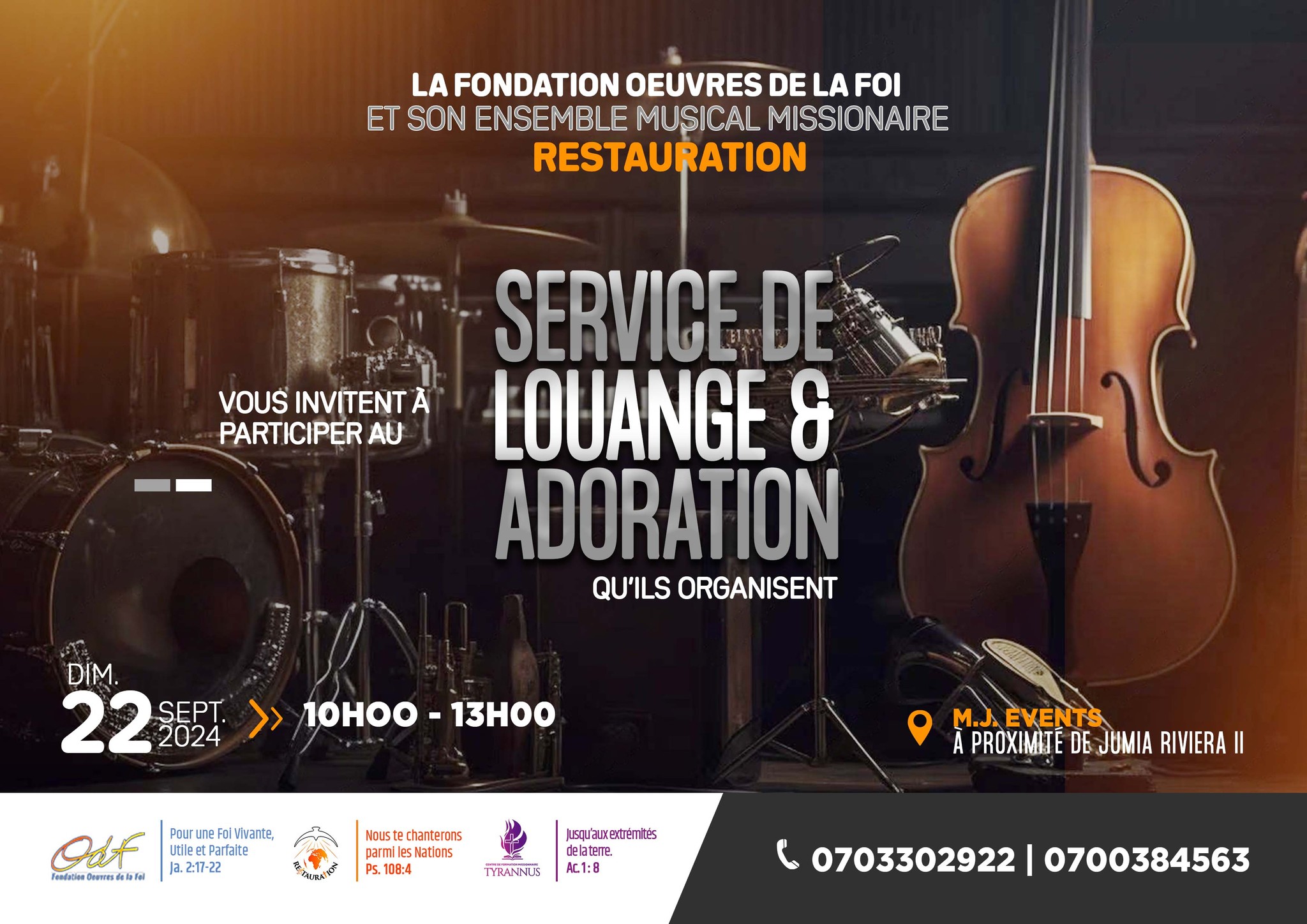 La Fondation Œuvres de la Foi (ODF) et son ensemble musical missionnaire RESTAURATION vous invitent à participer au Service de Louange et Adoration qu'ils organisent, le Dimanche 22 Septembre 2024, à partir de 10H00. Lieu: M. J. EVENTS , à proximité de Jumia Riviera 2. ? https://maps.app.goo.gl/odh1S2Hxazyuki7w8 Infoline: (+225) 07 9890 4417 | 07 5971 9638