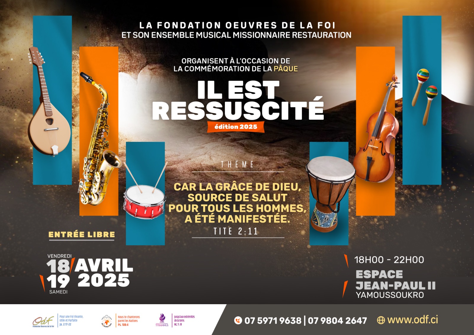 La Fondation Œuvres de la Foi et son ensemble musical missionnaire Restauration organisent, à l’occasion de la commémoration de la Pâque, "IL EST RESSUSCITÉ" Édition 2025. Thème: Car la grâce de Dieu, source de salut pour tous les hommes, a été manifestée. Tite 2:11 ?️ Date : Vendredi 18 et Samedi 19 avril 2025 ⏰ Heure : 18h00 - 22h00 ?Lieu : Espace Jean-Paul II, Yamoussoukro ?️ Entrée Libre ☎️ Contacts: +225 0759719638 | 0798042647 ? Site web : www.odf.ci