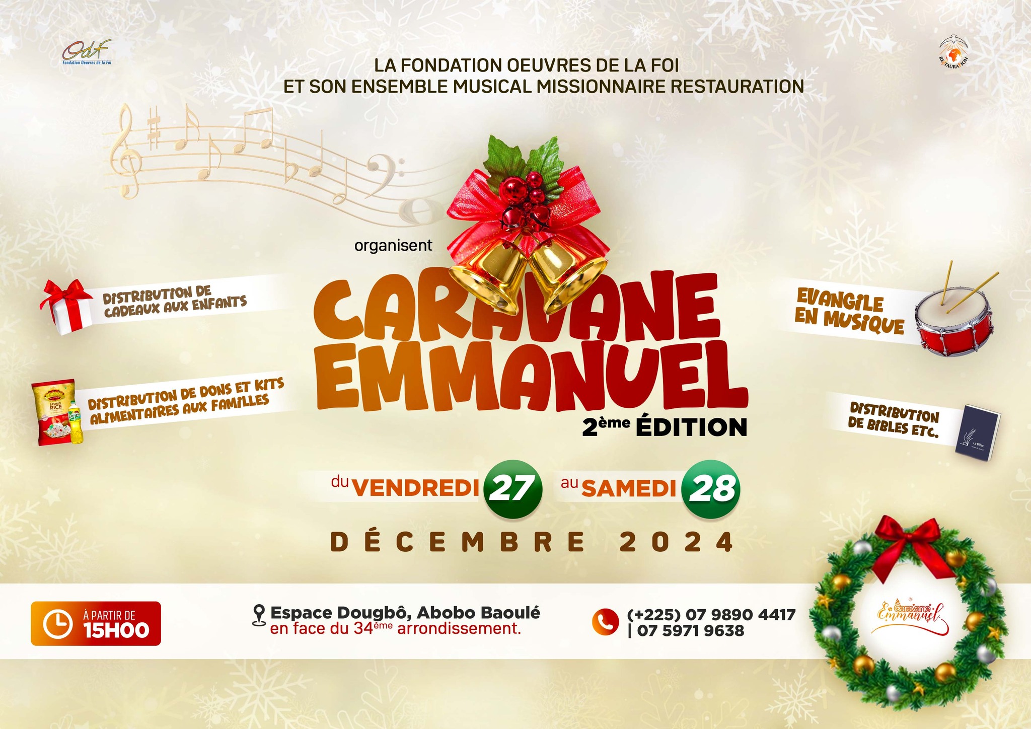 Dans le cadre de leurs activités de fin d’année (Noël et Nouvel an), la Fondation Œuvres de la Foi (ODF) et son Ensemble musical missionnaire RESTAURATION organisent la 2ème édition de la CARAVANE EMMANUEL, un événement de partage de l'amour de Dieu et du prochain. Du Vendredi 27 au Samedi 28 Décembre 2024, de 15h00 à 21h00. À l'espace Dougbô sis à Abobo Baoulé, en face du 34ème arrondissement. Au programme, dons de kits alimentaires aux familles, remises de cadeaux aux enfants et distributions gratuites de bibles, avec le soutien musical de l'ensemble RESTAURATION. Populations d’Abobo Baoulé, venez massivement participer à cet évènement qui est fait pour vous. Dieu vous bénisse ! ☎ 07 98 90 44 17 / 07 59 71 96 38 / 27 22 20 82 97