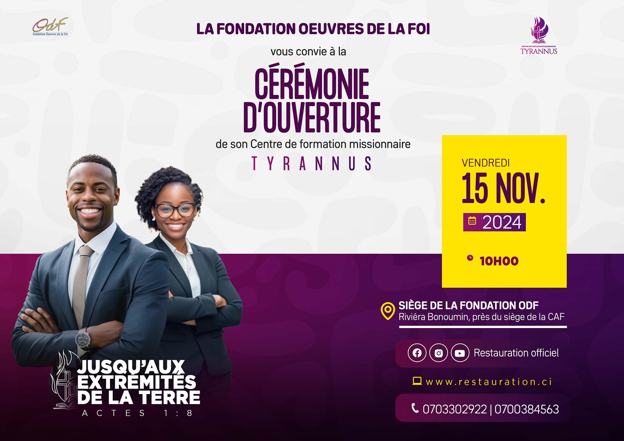 La Fondation Œuvres de la Foi (ODF) vous convie à la cérémonie d'ouverture son Centre de Formation Missionnaire, Tyrannus. ? Date: Vendredi 15 Novembre 2024 à partir de 10h00. ? Lieu: Siège de la Fondation ODF sis à la Riviera Bonoumin, près du siège de la CAF. ☎️ Infoline: (+225) 0703302922 | 0700384563 "Jusqu'aux extrémités de la terre" Ac. 1:8