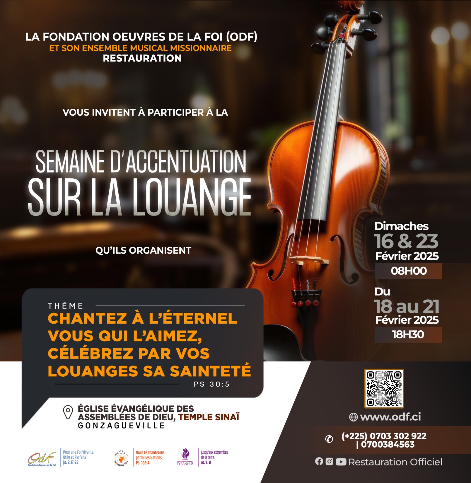 LA Fondation ŒUVRES DE LA FOI (ODF) et son ensemble musical missionnaire RESTAURATION vous invitent à participer à la semaine d'accentuation sur la Louange qu'ils organisent. THÈME: CHANTEZ À L’ÉTERNEL VOUS QUI L’AIMEZ, CÉLÉBREZ PAR VOS LOUANGES SA SAINTETÉ. (PS 30:5) DATES ET HORAIRES: Dimanches 16 & 23 Février 2025 ? 08H00 Du 18 au 21 Février 2025 ? 18H30 LIEU: ? Église Évangélique des Assemblées de Dieu, Temple Sinaï, GONZAGUEVILLE ? www.odf.ci ? (+225) 0703 302 922 / 0700384563