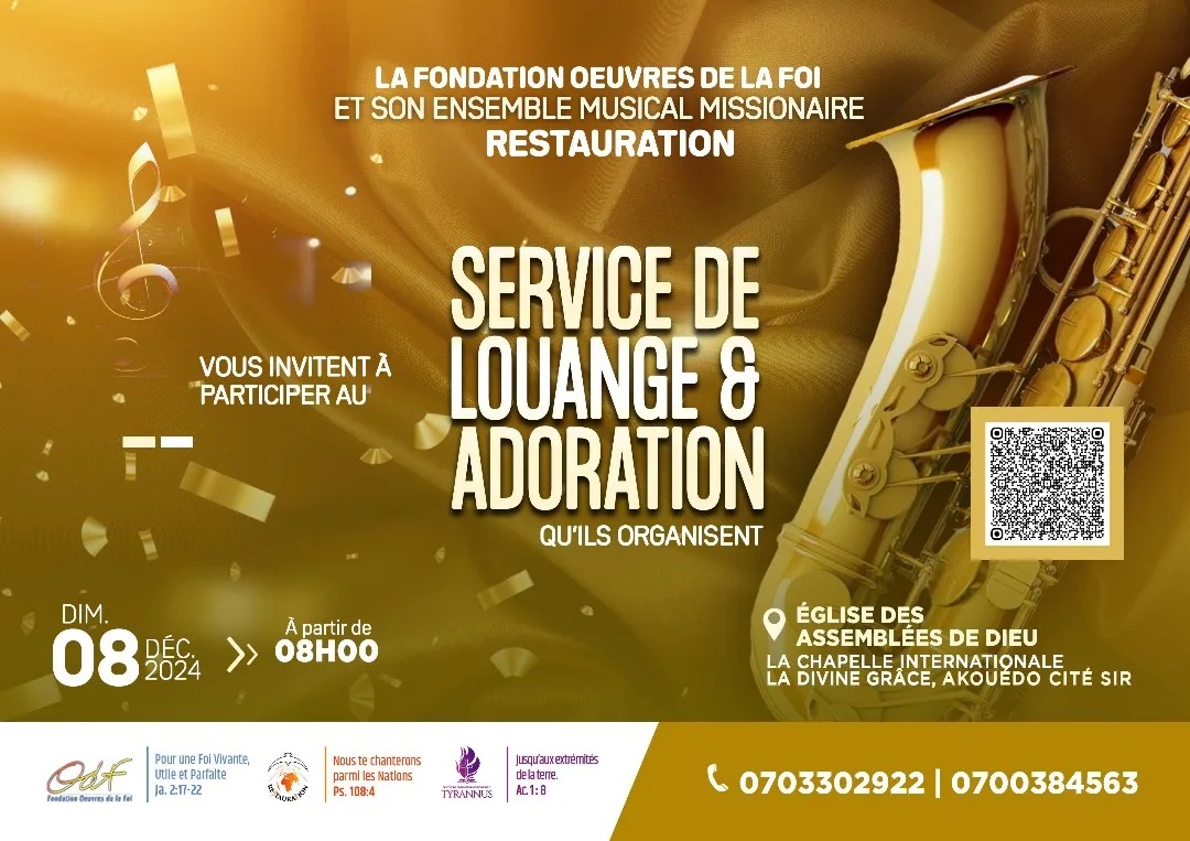 La Fondation Œuvres de la Foi (ODF) et son ensemble musical missionnaire RESTAURATION vous invitent à participer au Service de Louange et Adoration qu'ils organisent, le Dimanche 08 Décembre 2024, à partir de 08H00. Lieu: Église Évangélique des Assemblées de Dieu AKOUÉDO CITE SIR Chapelle Internationale LA DIVINE GRÂCE ? https://maps.app.goo.gl/QJ8ScfekpF91F2WL7 Infoline: (+225) 07 9890 4417 | 07 5971 9638