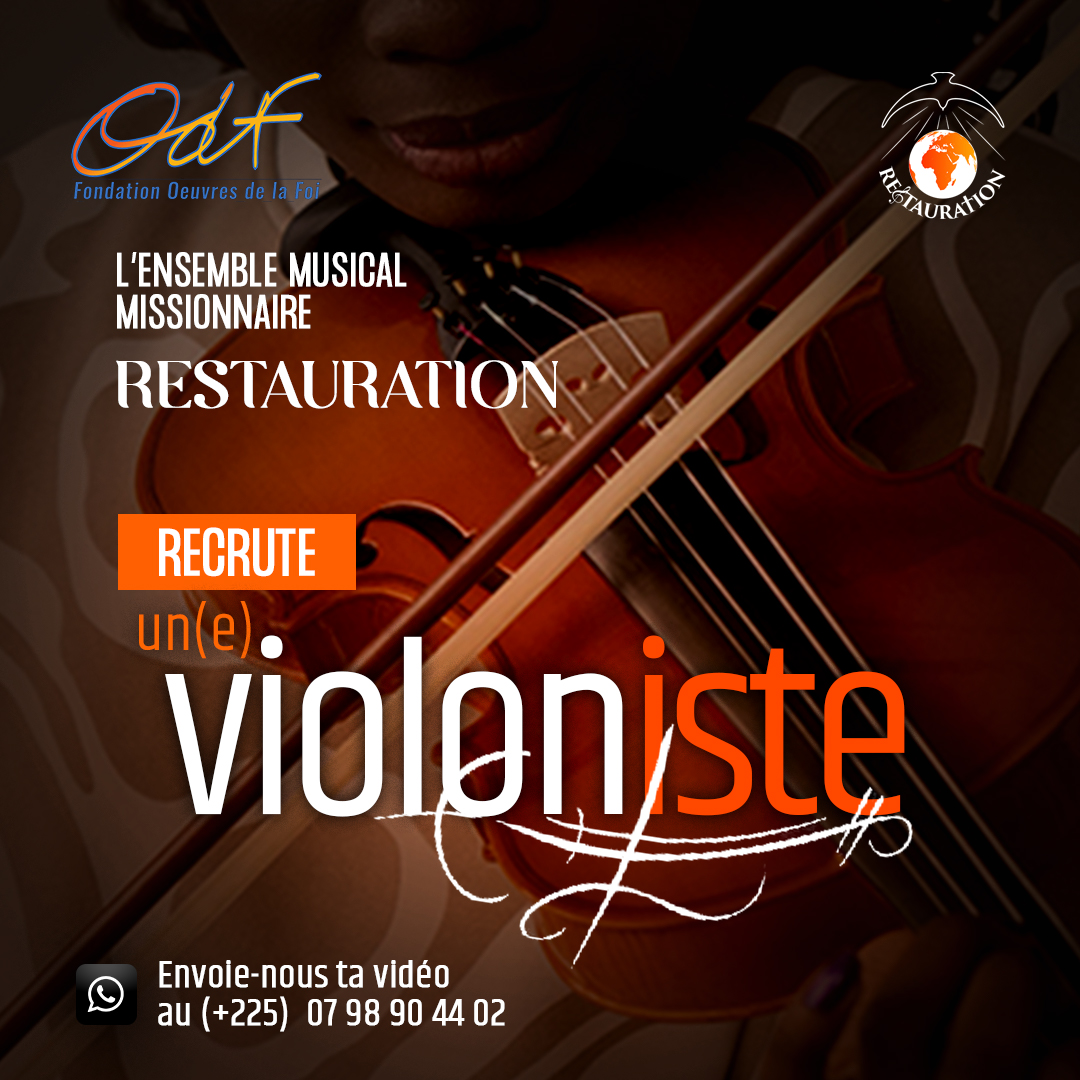 Tu es violoniste professionnel(le), Tu es chrétien (ne), Et tu souhaites mettre ton talent au service de l'œuvre missionnaire, à plein temps, Envoie-nous urgemment une vidéo de toi jouant de ton instrument, via WhatsApp au (+225) 07 98 90 44 02 Alors, n'attends plus ! ? You are a professional violinist, You are Christian), And you wish to put your talent to the service of missionary work, full time, Urgently send us a video of you playing your instrument, via WhatsApp at (+225) 07 98 90 44 02 Don't wait anymore ! ?