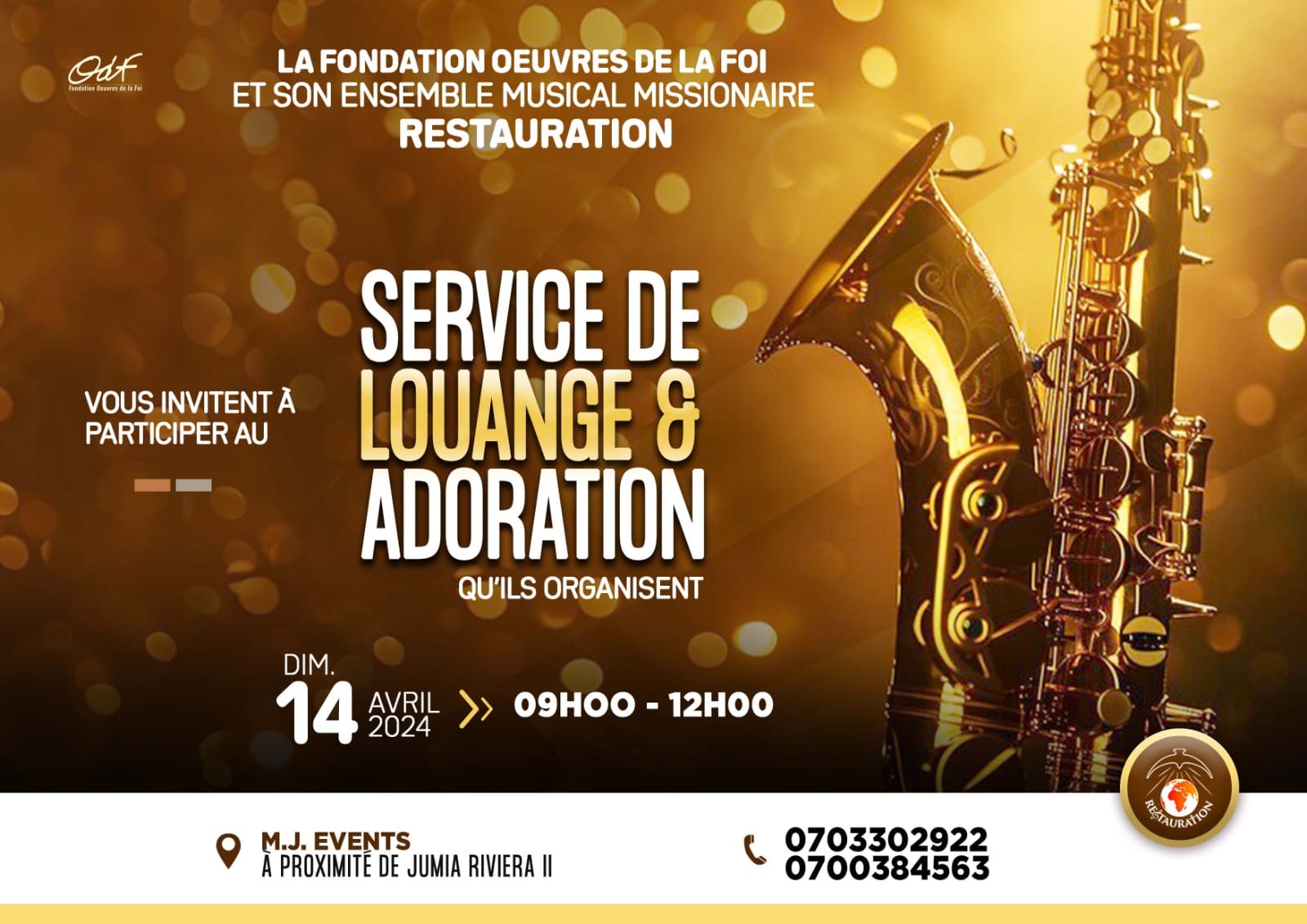 La Fondation Œuvres de la Foi (ODF) et son ensemble musical missionnaire RESTAURATION vous invitent à participer au Service de Louange et Adoration qu'ils organisent, le Dimanche 14 Avril 2024, à partir de 09H00. Lieu: M. J. EVENTS , à proximité de Jumia Riviera 2. ? https://maps.app.goo.gl/odh1S2Hxazyuki7w8 Infoline: (+225) 07 9890 4417 | 07 5971 9638