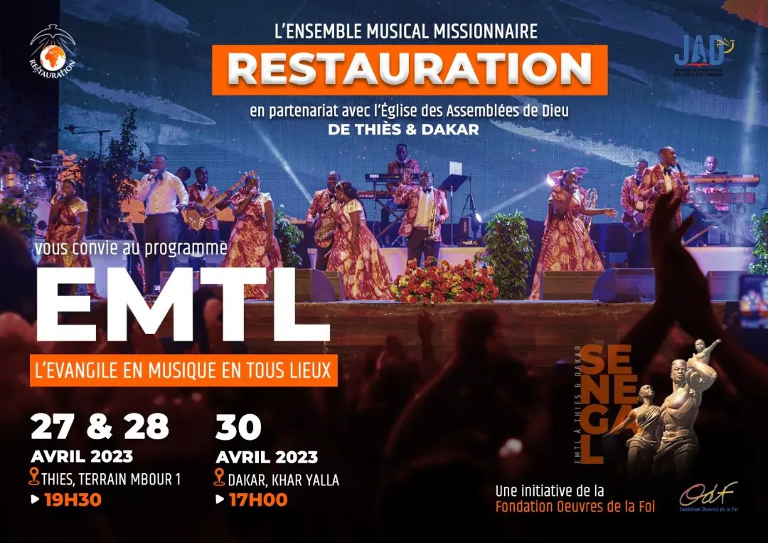 C O N F I R M A T I O N La Fondation ODF (Œuvres de la Foi) en collaboration avec les Églises Évangéliques des Assemblées de Dieu de Thiès et Dakar, convie toutes les populations de ces merveilleuses villes à son programme EMTL (l'Évangile en Musique en Tous Lieux), qui sera conduit par son ensemble musical missionnaire RESTAURATION. Vous êtes tous les bienvenus à cet événement inédit. Dieu vous bénisse abondamment ?