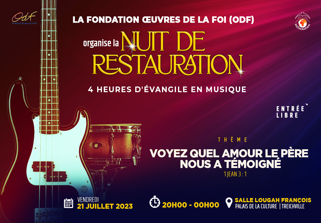 Tous les écrits bibliques convergent vers un seul point essentiel : L'amour de Dieu pour l'homme. En effet, c’est par amour que Dieu a créé le ciel, la terre, la mer et tout ce qui s’y trouve. C’est par amour que Dieu s’est révélé aux hommes en leur donnant ses lois et ordonnances destinés à les conduire sur le chemin qui mène à la vie. Jésus, le Fils bien-aimé en qui le Père a mis toute son affection est venu aimer ceux qui sont méprisés, délaissés, rejetés et marginalisés. Et, c’est aussi par amour qu’il a paru comme un simple homme, pris une forme de serviteur et lavé les pieds de ses disciples, qu’il a pardonné à la femme adultère et qu’il a été obéissant jusqu’à la mort de la croix. Aujourd’hui encore la puissance de l’amour de Dieu sauve les pécheurs, délivre les alcooliques et les drogués, chasse les démons et libère les captifs, guérit ceux qui ont le cœur brisé, donne la vue aux aveugles, redonne l’espoir, libère de la colère et de l’amertume, donne la paix et le vrai bonheur. Quand l’amour de Dieu remplit un cœur, il déborde de bonheur. Ne ratez pas la NUIT DE RESTAURATION. Venez (re) découvrir l'amour du Dieu Vivant et Vrai avec des musiciens et chanteurs remplis de talents.