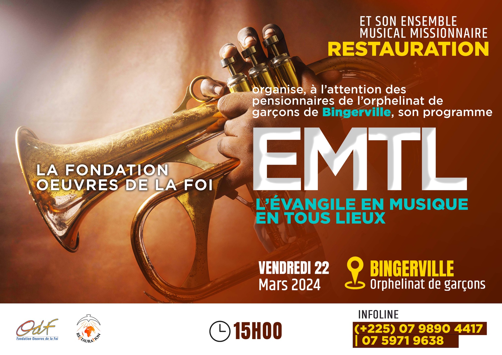 La Fondation Œuvres de la Foi (ODF) et son ensemble musical missionnaire RESTAURATION organisent, à l'attention des pensionnaires de l'orphelinat de garçons de Bingerville, leur programme EMTL (l'Evangile en Musique en Tous Lieux), le Vendredi 22 Mars 2024, à partir de 15H00. Lieu: Bingerville, orphelinat de garçons. "Grâces soient rendues à Dieu, qui nous fait toujours triompher en Christ, et qui répand par nous en tout lieu l'odeur de sa connaissance !" 2 Corinthiens, 2:14 Infoline: (+225) 07 9890 4417 | 07 5971 9638