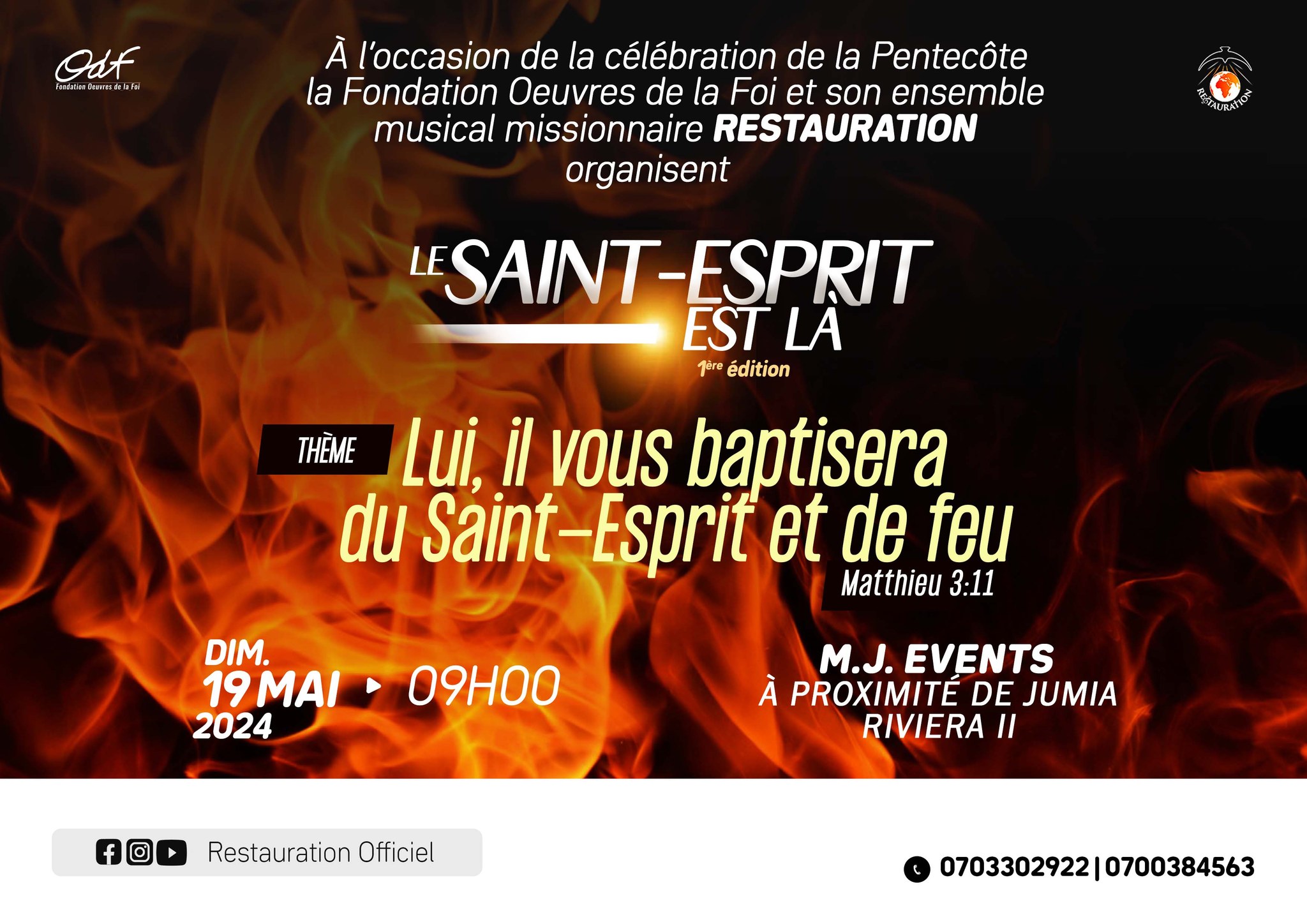 À l’occasion de la célébration de la Pentecôte, la Fondation Œuvres de la Foi et son ensemble musical missionnaire Restauration organisent LE SAINT ESPRIT EST LÀ 1ère édition. Thème: Lui, il vous baptisera du Saint-Esprit et de feu (Matthieu 3:11). Date: le Dimanche 19 Mai 2024. Horaire: 09H00 - 12H00. Lieu: M. J. Espace, à proximité de Jumia Riviera II ? https://maps.app.goo.gl/odh1S2Hxazyuki7w8 Infoline: (+225) 07 9890 4417 | 07 5971 9638