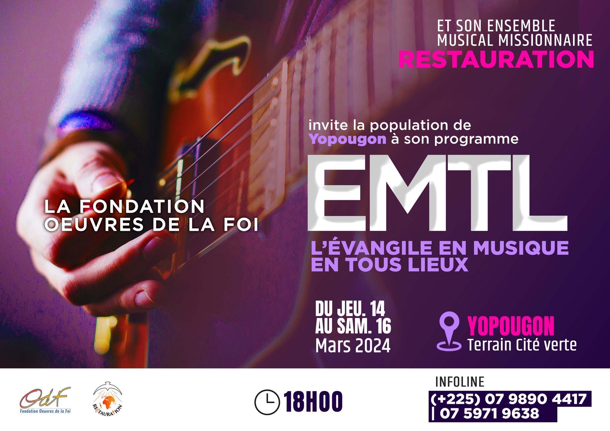 La Fondation Œuvres de la Foi (ODF) et son ensemble musical missionnaire RESTAURATION invitent la population de YOPOUGON à participer massivement à leur programme EMTL (l'Evangile en Musique en Tous Lieux), du Jeudi 14 au Samedi 16 Mars 2024, à partir de 18H00. Lieu: YOPOUGON, Terrain de la cité verte "Car Dieu a tant aimé le monde qu'il a donné son Fils unique, afin que quiconque croit en lui ne périsse point, mais qu'il ait la vie éternelle." Jean, 3:16 Infoline: (+225) 07 9890 4417 | 07 5971 9638
