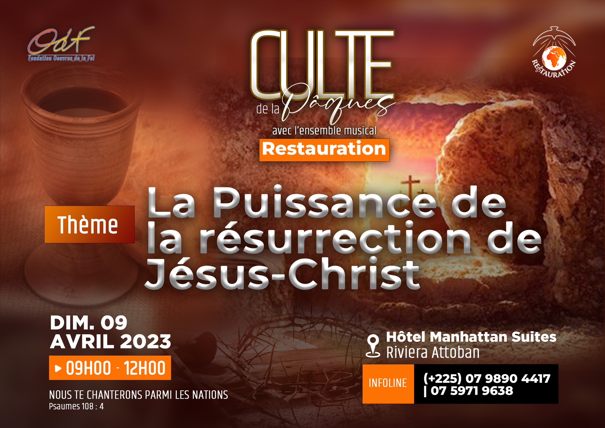 Viens expérimenter la Puissance de la résurrection de Jésus-Christ ! Viens au Culte de la Pâques ! Viens élever Jésus-Christ par ta louange ! Demain, Dimanche 09 Avril 2023, à l'Hôtel Manhattan Suites, à partir de 09H00. Ne viens pas seul(e) !