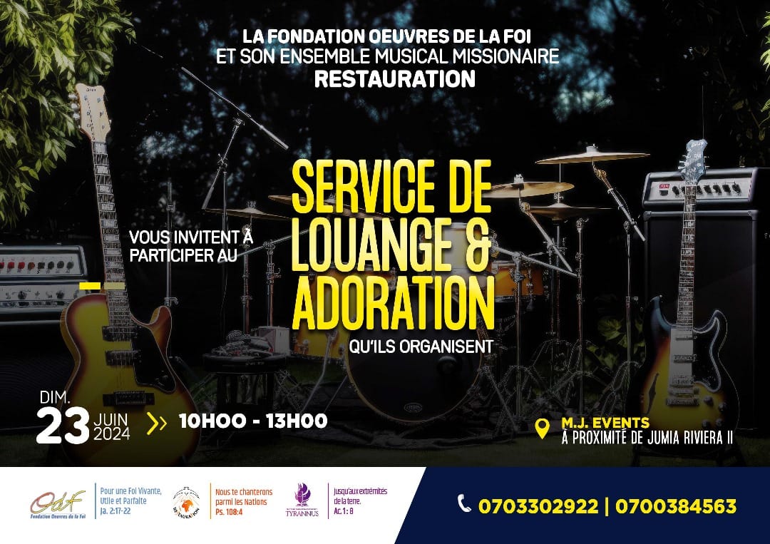 La Fondation Œuvres de la Foi (ODF) et son ensemble musical missionnaire RESTAURATION vous invitent à participer au Service de Louange et Adoration qu'ils organisent, le Dimanche 23 Juin 2024, à partir de 10H00. Lieu: M. J. EVENTS , à proximité de Jumia Riviera 2. ? https://maps.app.goo.gl/odh1S2Hxazyuki7w8 Infoline: (+225) 07 9890 4417 | 07 5971 9638